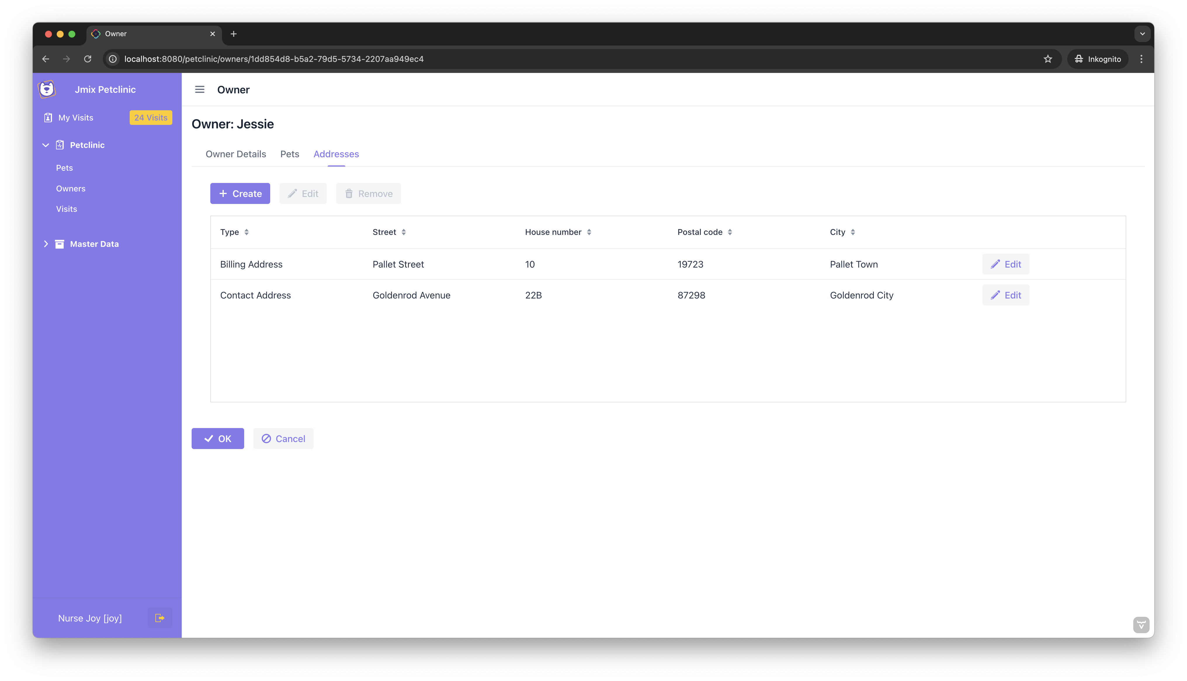 In the context of the Jmix Petclinic example, the relationship between an Owner