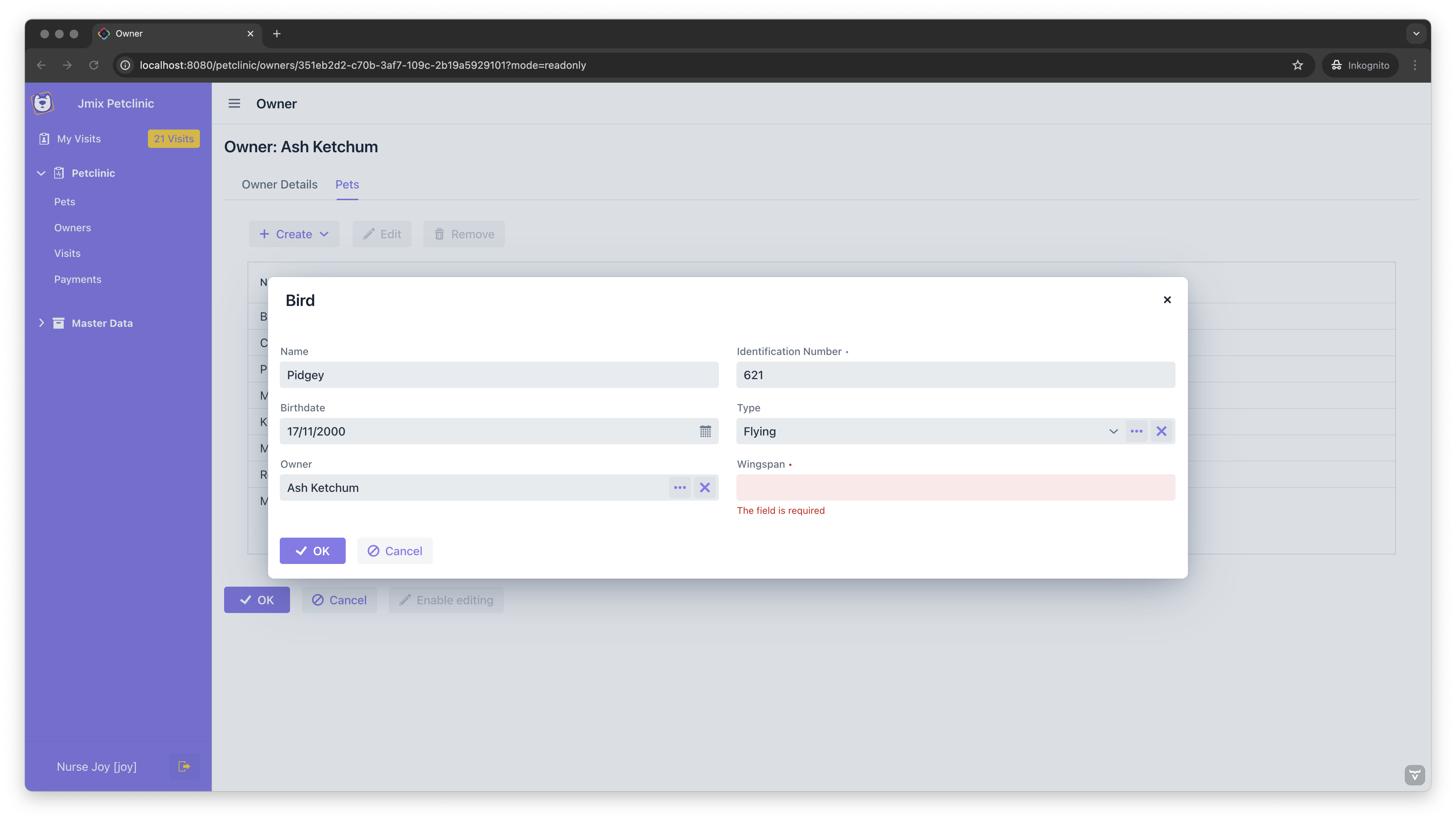 Similar to the Visit example we need to determine which exact subclass should be used, when we create a Pet. This time we use a Dropdown Button for creating new pets in both the Owner Detail View