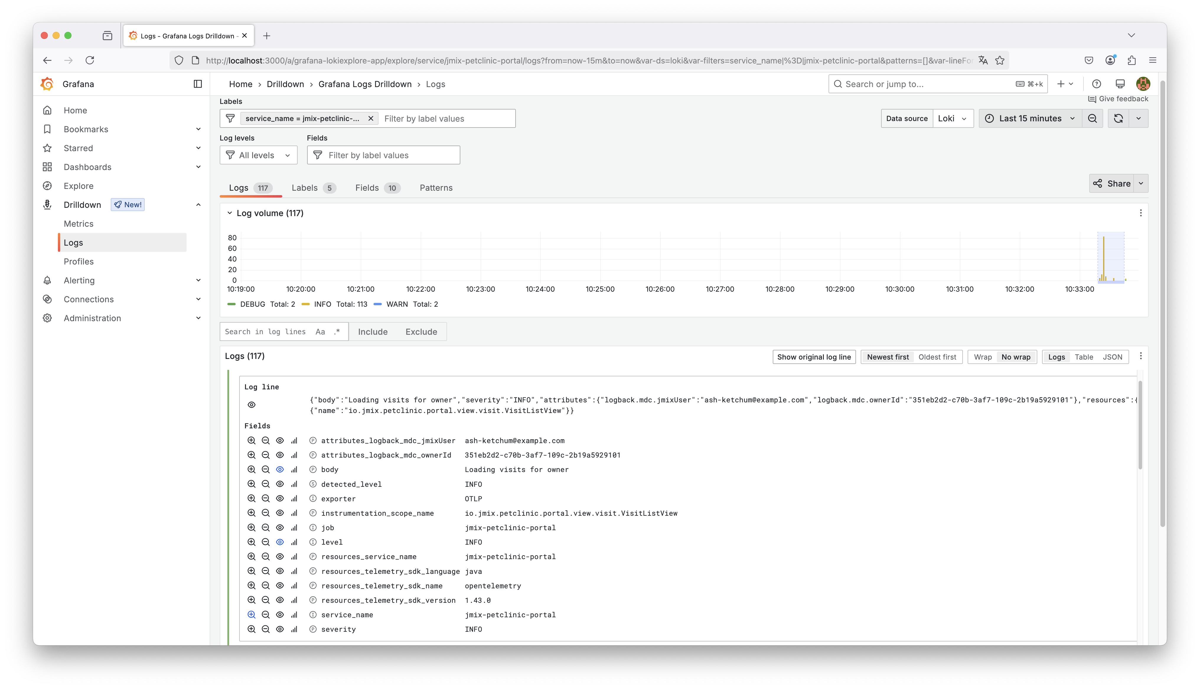 In this guide, we first created a lightweight, consumer‑facing Petclinic Portal application to sit alongside the classic Petclinic backend, giving us two independent Jmix services to showcase centralized logging across multiple systems. With that pair in place, we then built a complete, end‑to‑end logging pipeline: Docker‑based Grafana Loki for log storage, Grafana for exploration, and an OpenTelemetry Collector that receives OTLP data and forwards it to Loki. Both apps were configured to emit structured logs instead of plain text, giving every entry machine‑readable fields like service_name, attributes_logback_ownerId, and other custom MDC values.
