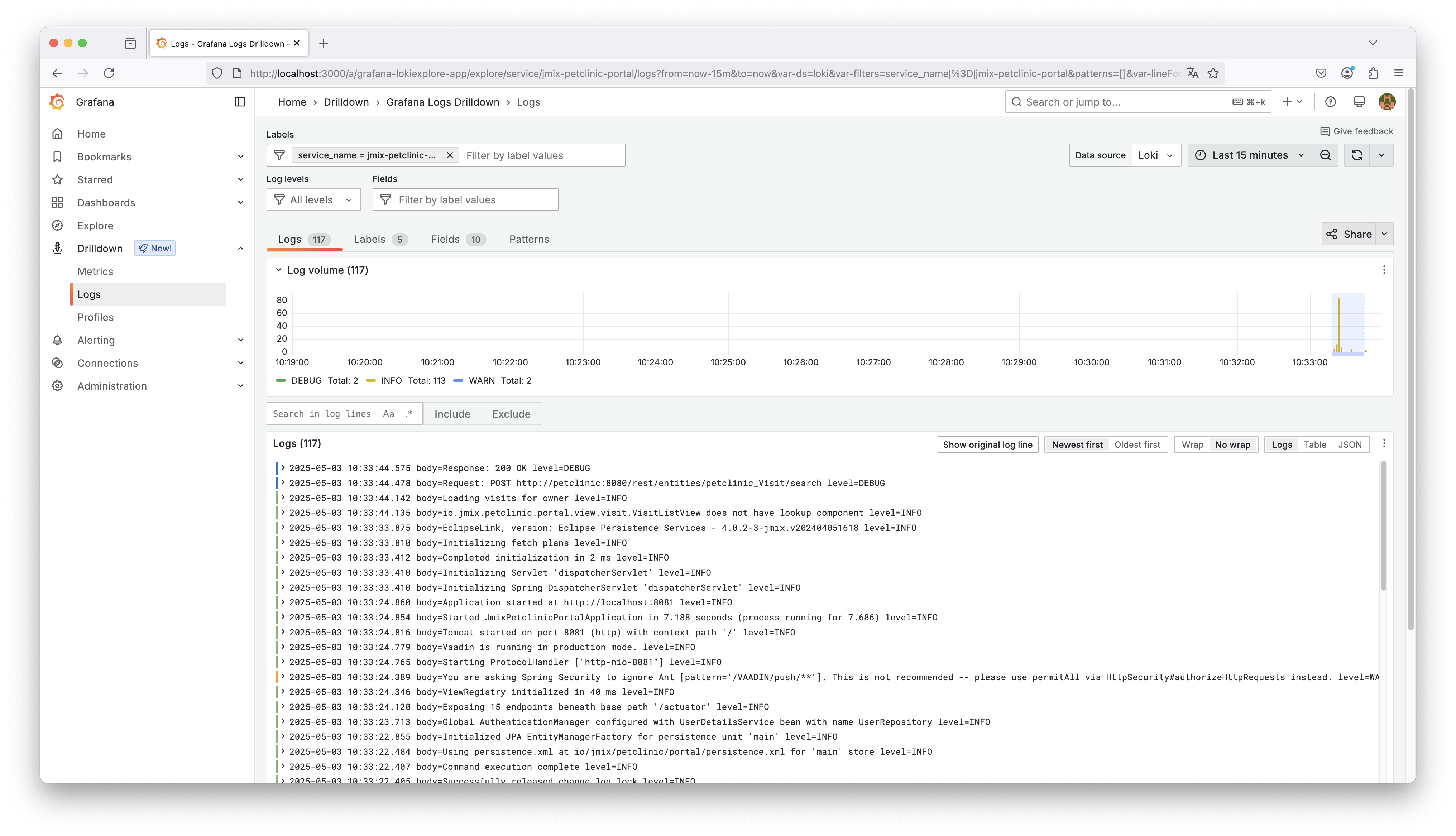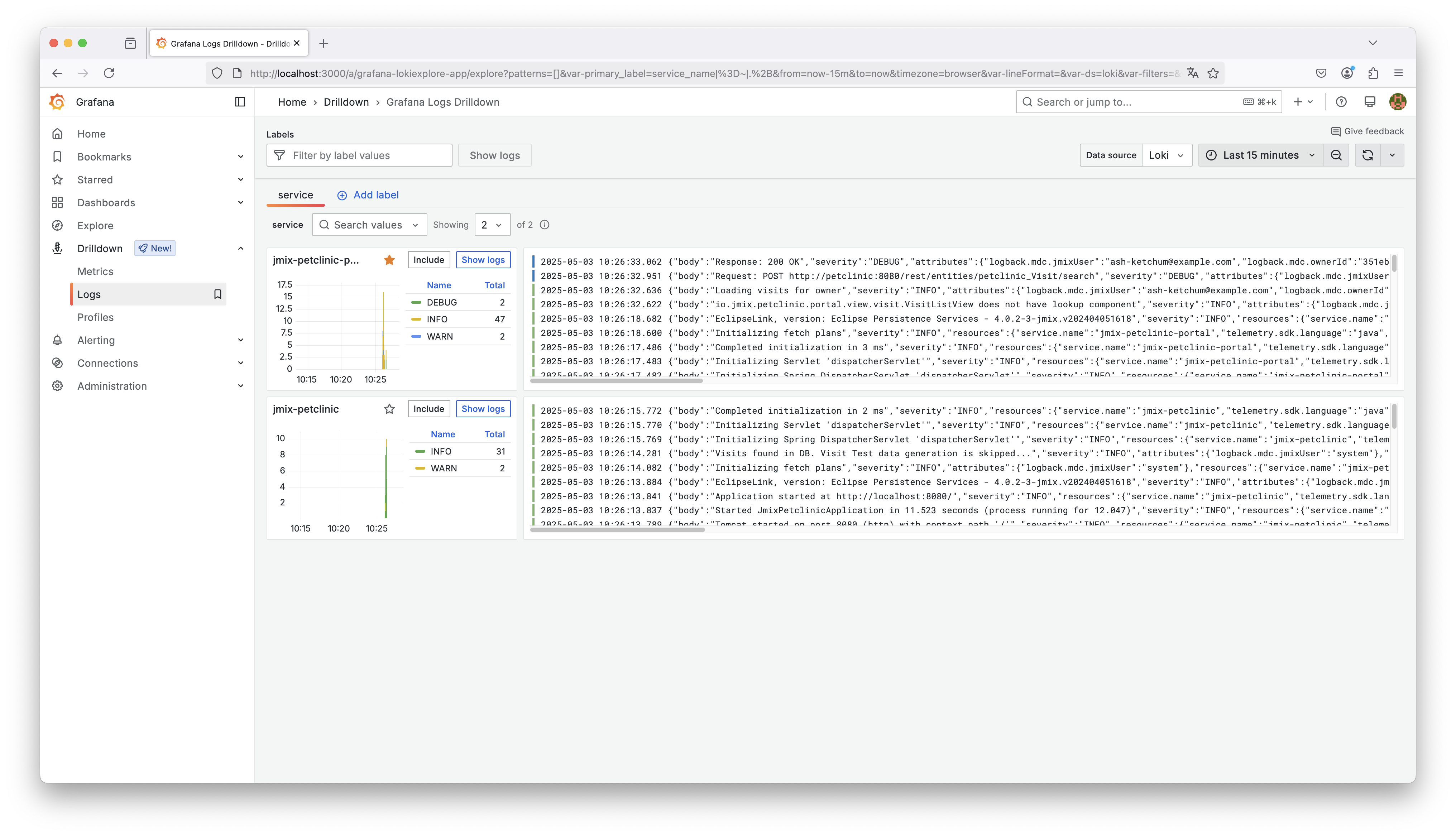 The screenshot above shows a unified view in Grafana’s Log UI. Each application appears as a separate service label (jmix-petclinic and jmix-petclinic-portal). As we can see both applications started logging into Loki.