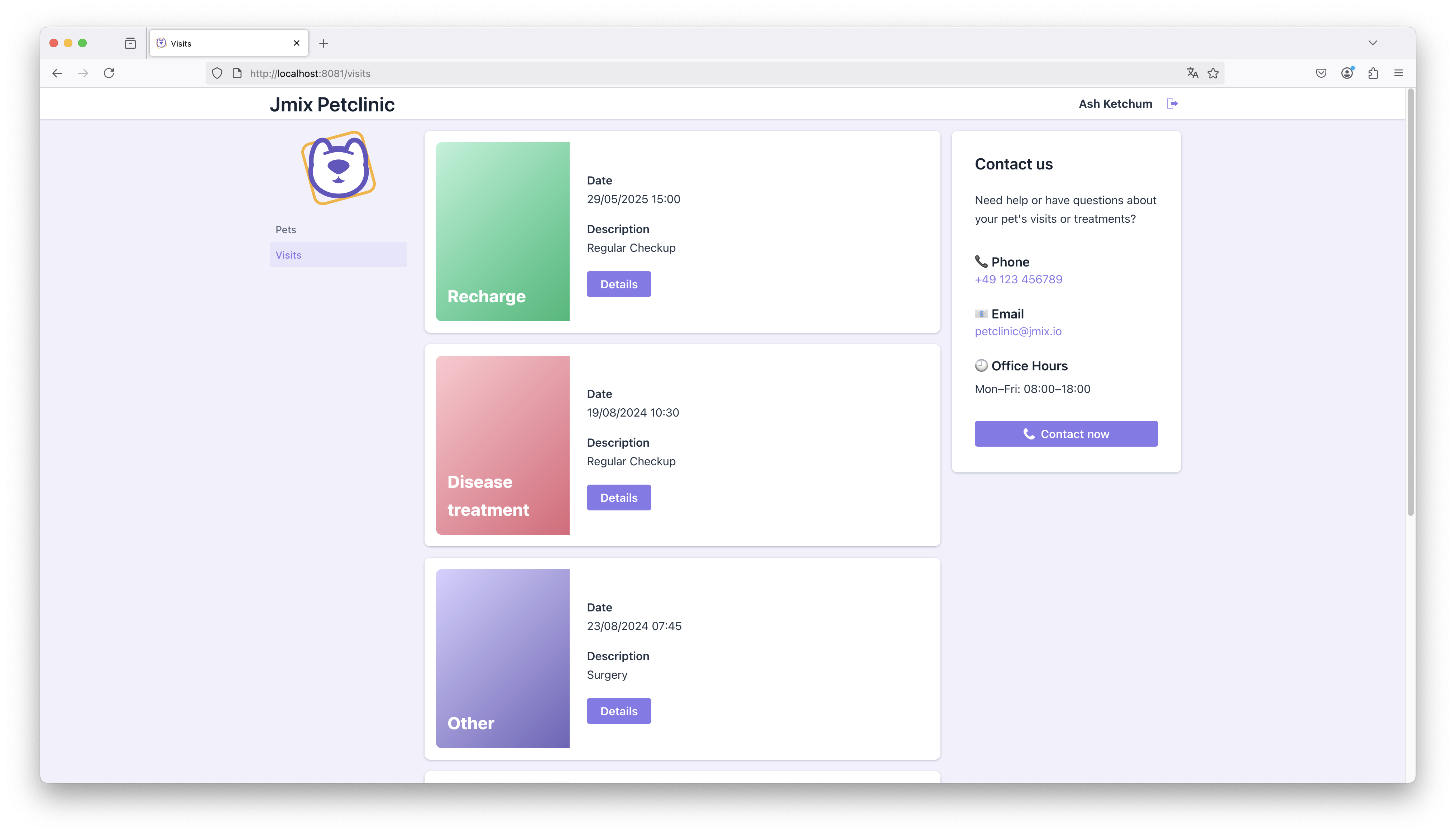 The Petclinic Portal uses a fully customized layout that intentionally deviates from the typical look of a business application. Instead of relying on standard Jmix or Vaadin UI components, the layout mimics elements of modern websites — including scrollable views, card-based presentation, and visually grouped sections.