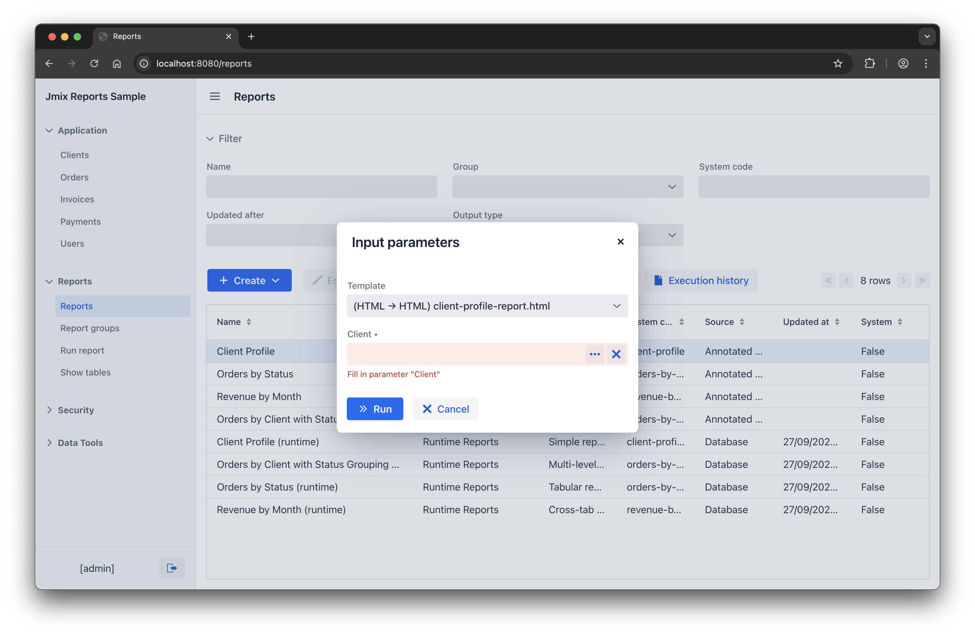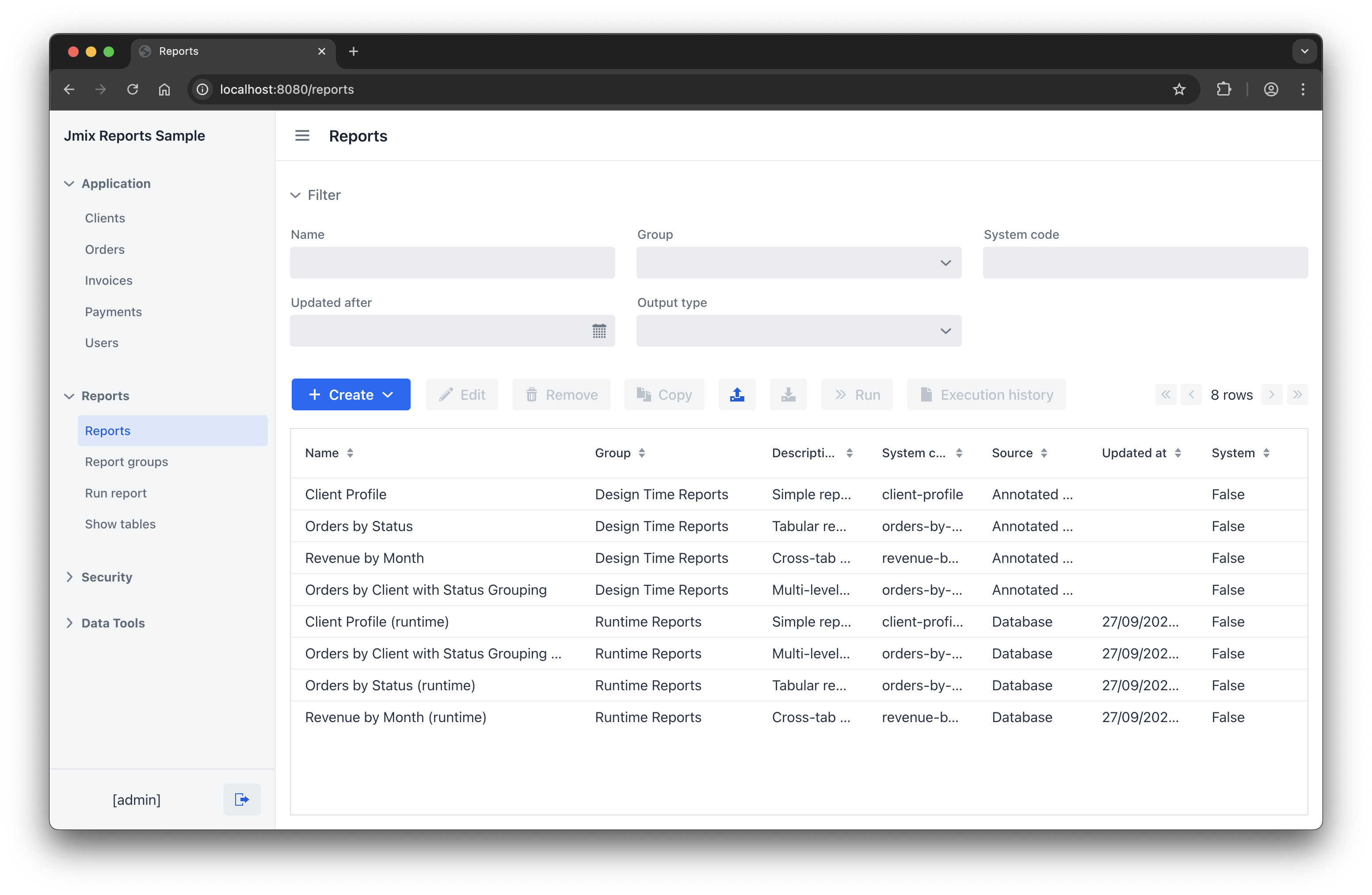 Open the project in your IDE with the Jmix Studio plugin installed. Run the application using the Jmix-reports-sample Jmix Application
