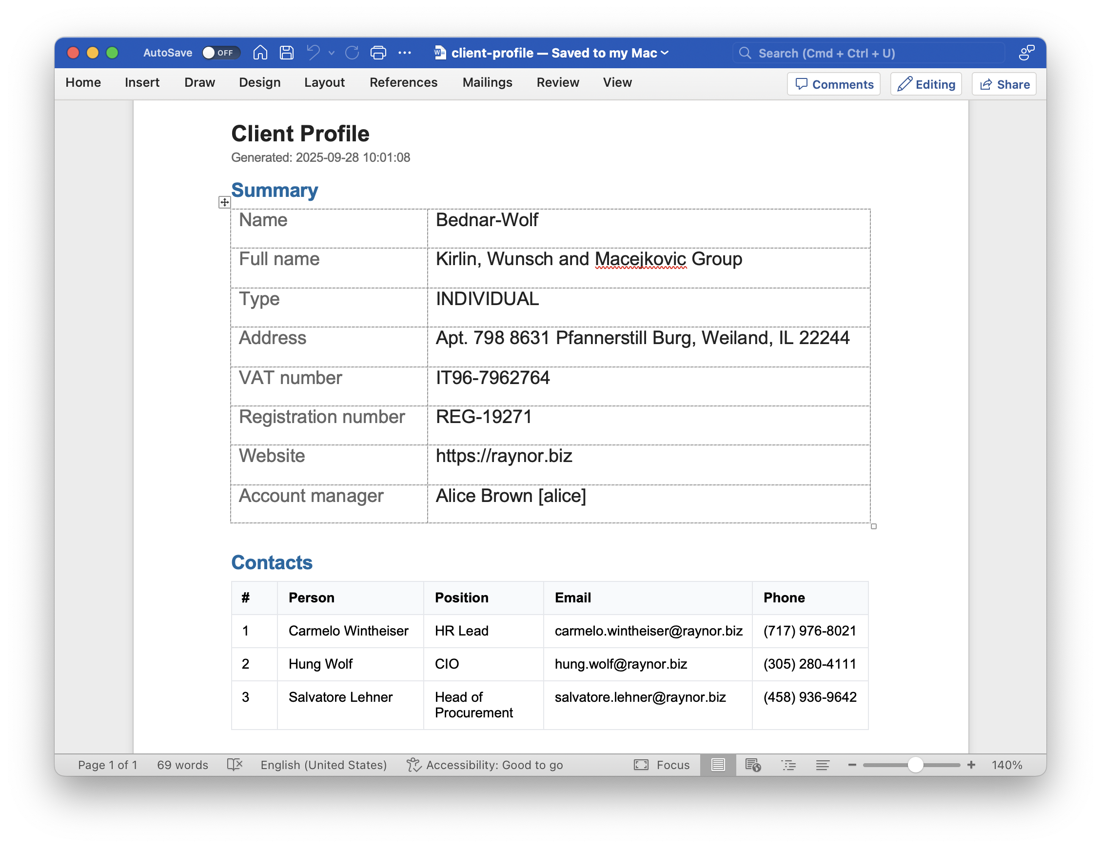 This report provides complete information about a client, including the list of contacts. It has a master-detail structure and offers multiple templates and output formats.
