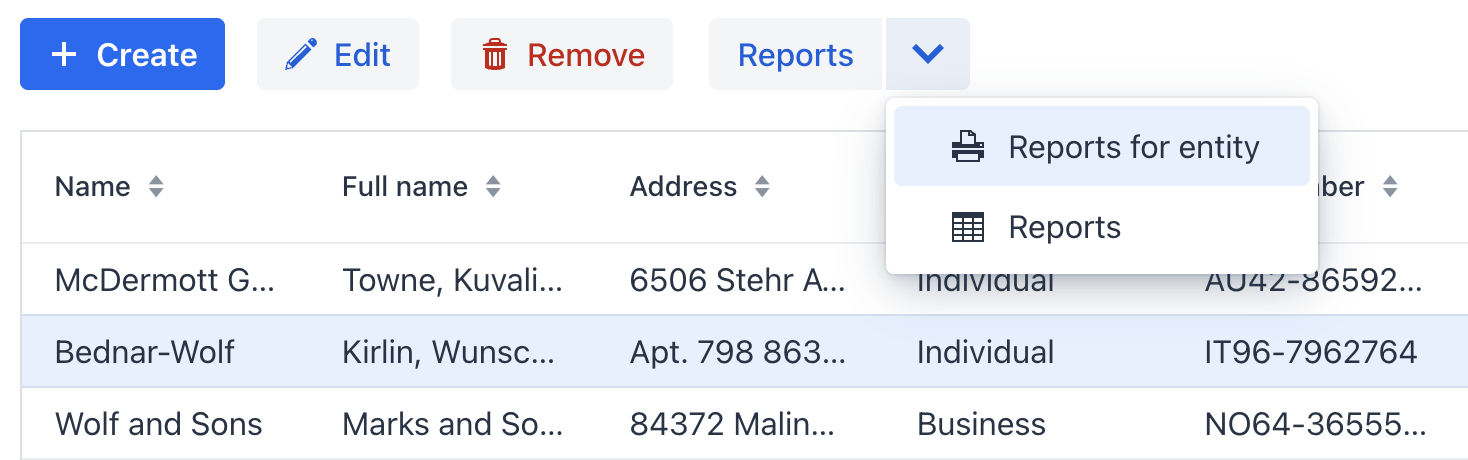 The Reports for entity button allows you to select a template and a client the same as in the list view. The Print client profile button just prints the report right away for the edited entity using the HTML template and HTML output: