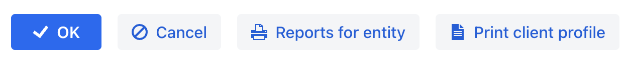If you open the client detail view, you will see two additional buttons at the bottom: Reports for entity and Print client profile: