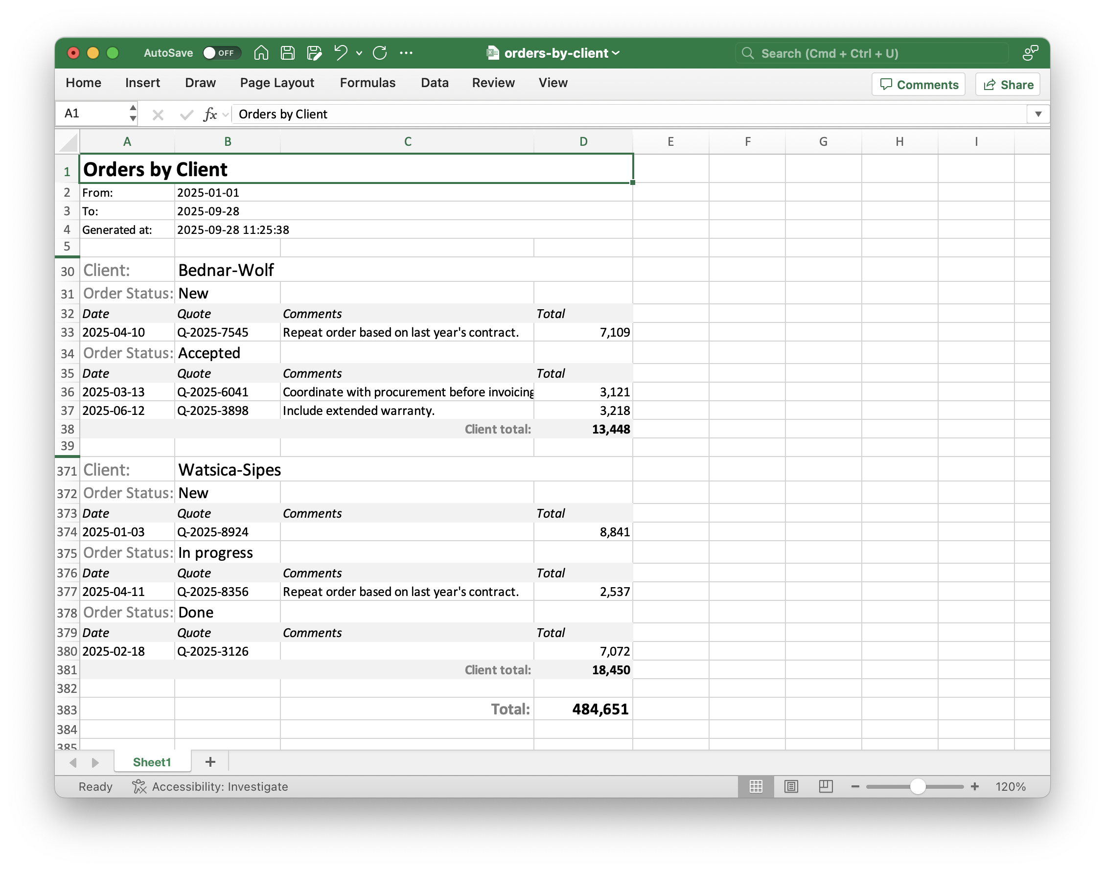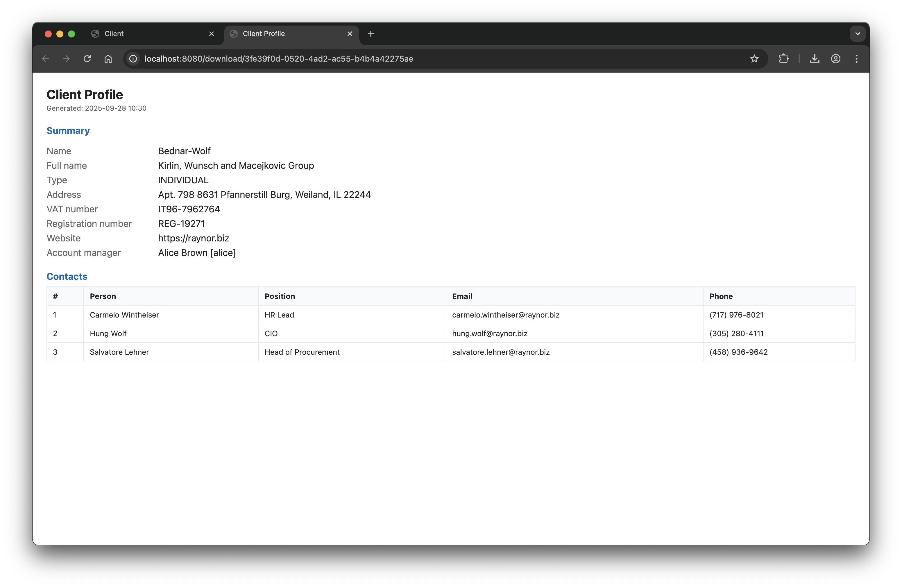Select one of the templates and a client and click Run. The application will generate the report and either open the result in a new browser tab or download it as a file, depending on the output type.