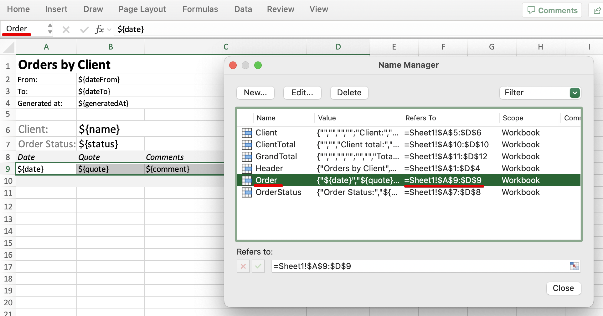 Multiple template types: HTML with Freemarker directives, DOCX with placeholders, XLSX with named ranges and diagrams.